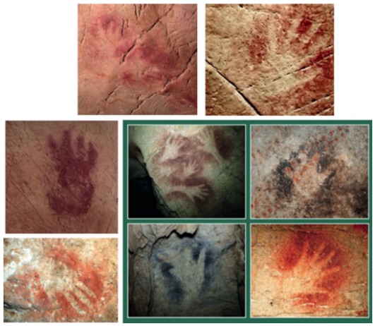 - Dibujo y pintura: Muchas cuevas prehistóricas tienen huellas de manos en diferentes paredes. Verdaderamente, conseguir que el pigmento soplado sobre la mano se fije a la pared de la cueva, o embadurnarse las manos con algún tipo de pintura para luego ponerlas en la pared de la cueva son los métodos más antiguos utilizados para la creación de arte rupestre. Podemos hacer algo parecido y hacer que los niños se pongan pintura en las manos y dejen huellas en cartulinas grandes, o que coloquen las manos en trozos de cartulina y dibujen o pinten los espacios que quedan (obteniendo así un «negativo» de sus manos). Después podemos colgar las cartulinas, o alternativamente, escanear las huellas individuales y componer imágenes con todas las huellas de las manos utilizando programas informáticos de dibujo e ilustración. Estas composiciones de imágenes pueden imprimirse y colgarse o proyectarse en las paredes. También pueden añadirse dibujos infantiles de animales a los cartones o a las imágenes proyectadas.